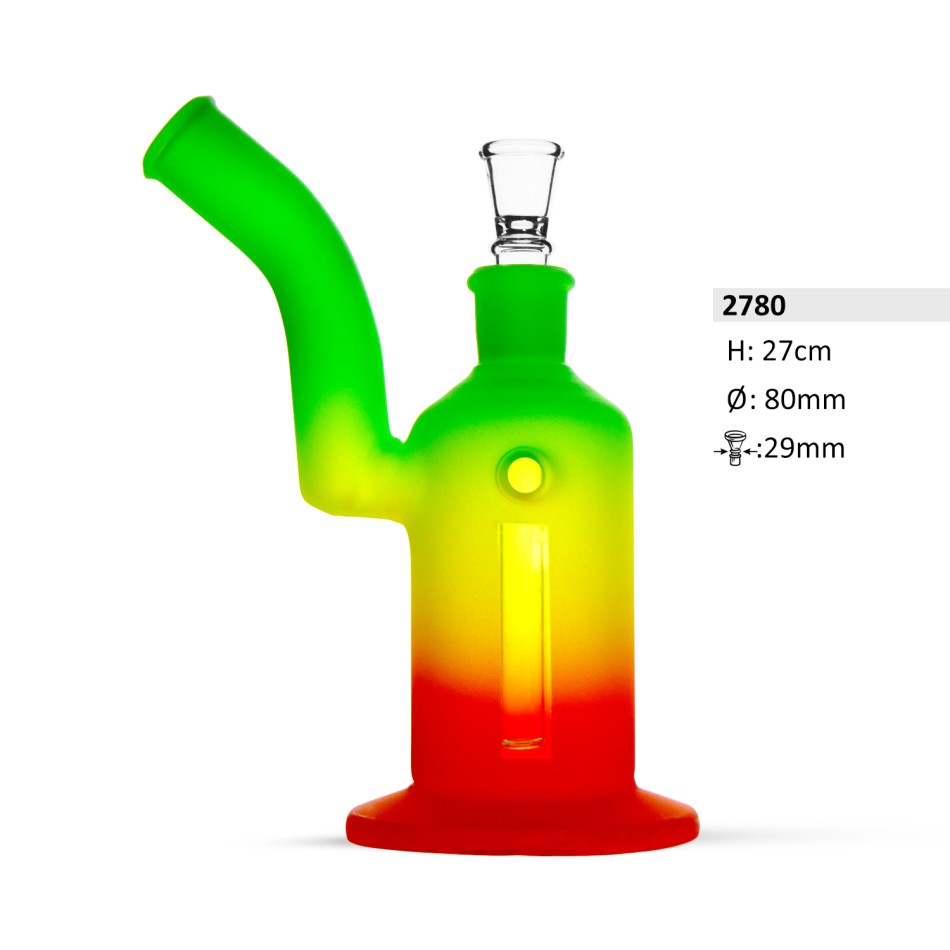 Glas Bong Rasta mit Fuss ,seitlich gebog. mund stück mit Fenster | H: 27cm Ø: 80mm, Schliff: 29mm