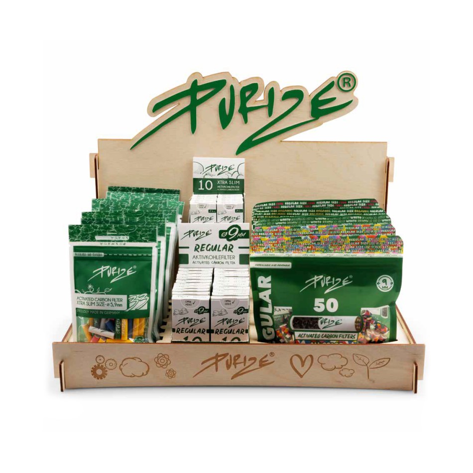 Das „POS System S“ ist Ihr praktisches, vorgepacktes Kit, wenn Sie die Marke PURIZE® in Ihrem Geschäft einführen möchten. Es enthält eine sorgfältig ausgewählte Auswahl unserer absoluten Bestseller – kleine, handliche Filterpacks, die Kunden gerne spontan mitnehmen. Gefertigt aus graviertem Holz und versehen mit unserem Logo, zieht dieses Display auf Theken und Regalen alle Blicke auf sich. Mit kompakter Stellfläche und großer Wirkung ist es ideal für Spontankäufe und Markenpräsenz.