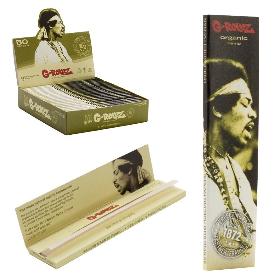 Diese G-Rollz-Papiere werden in Frankreich aus fein gepressten Pflanzenfasern und Akazienharz als natürlichem Gummi hergestellt. Alle Zutaten sind natürlich und sorgen für ein pures Rollerlebnis. Jedes Heftchen enthält 50 Kingsize-Blätter und in einem Display/einer Box befinden sich 25 Hefte. Dies sind exklusive Radio Days Artworks. Die Echtheit jedes Heftchens kann durch Scannen seines QR-Codes einzeln überprüft werden.