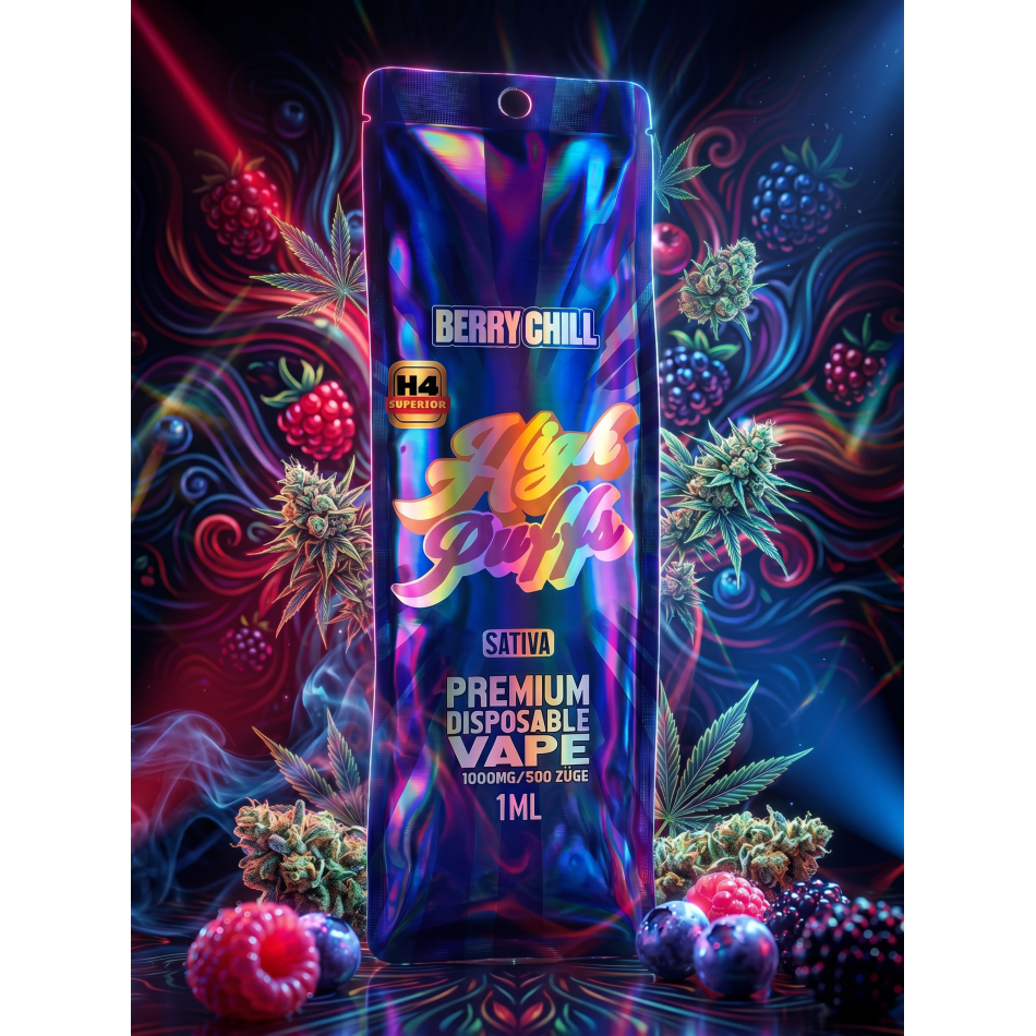Erlebe intensiven Geschmack und entspannende Indica-Wirkung mit dem High Puffs – Berry Chill Vape Pen. Diese hochwertige Einweg-E-Zigarette bietet bis zu 500 Züge voller aromatischer Terpene und Cannabinoide in einer perfekt ausgewogenen Mischung.