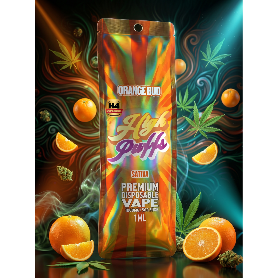Erlebe intensiven Geschmack und entspannende Indica-Wirkung mit dem High Puffs – Orange Bud Vape Pen. Diese hochwertige Einweg-E-Zigarette bietet bis zu 500 Züge voller aromatischer Terpene und Cannabinoide in einer perfekt ausgewogenen Mischung.