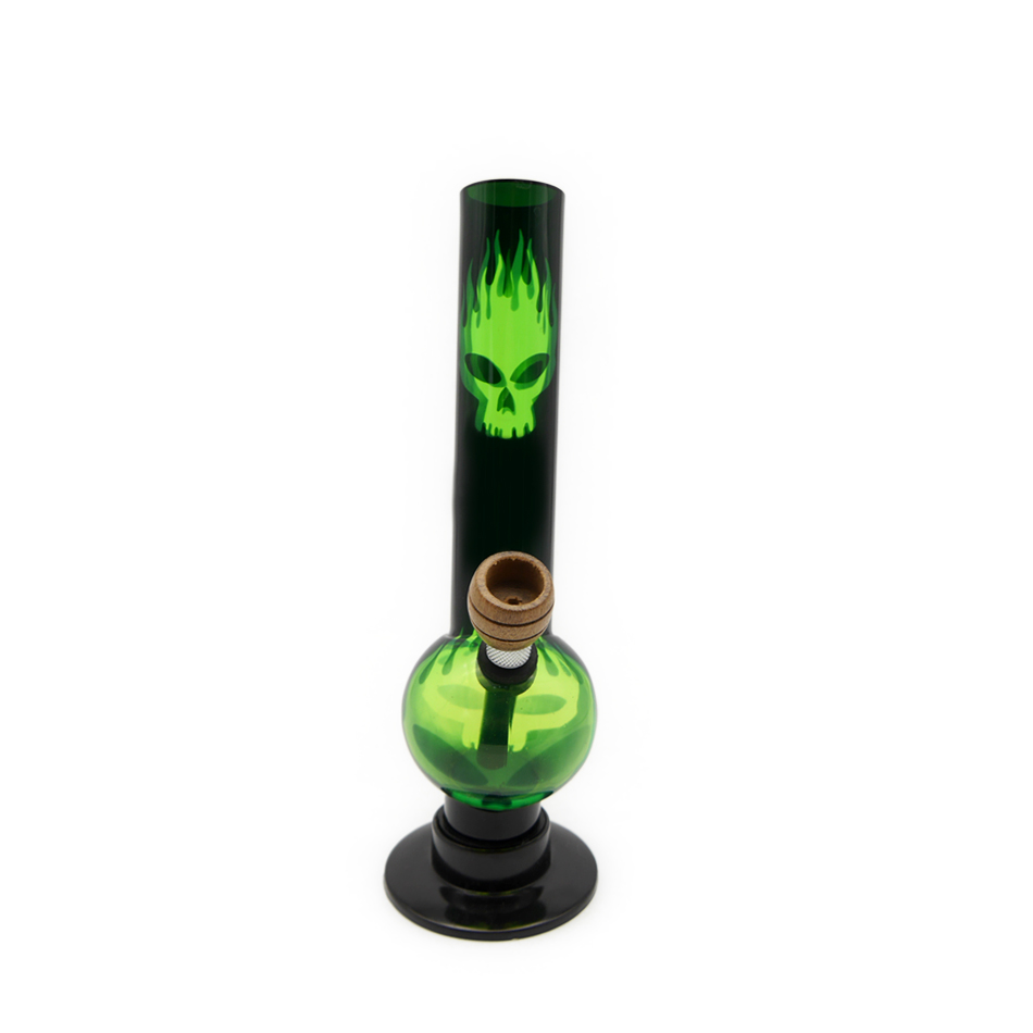 Acrylbong Grün / Schwarz gebogene mit Toten Kopf & Flamme Motiv Øca. 28mm, 21cm hoch