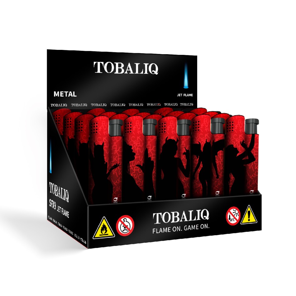 Stylisches Jet-Flame-Feuerzeug im edlen Design. Das Modell  DEVIL GIRL von Tobaliq überzeugt mit starker, windresistenter Flamme und robuster Verarbeitung. Geliefert im praktischen 25er Display – perfekt für Eigenbedarf, Weiterverkauf oder als edles Geschenk.