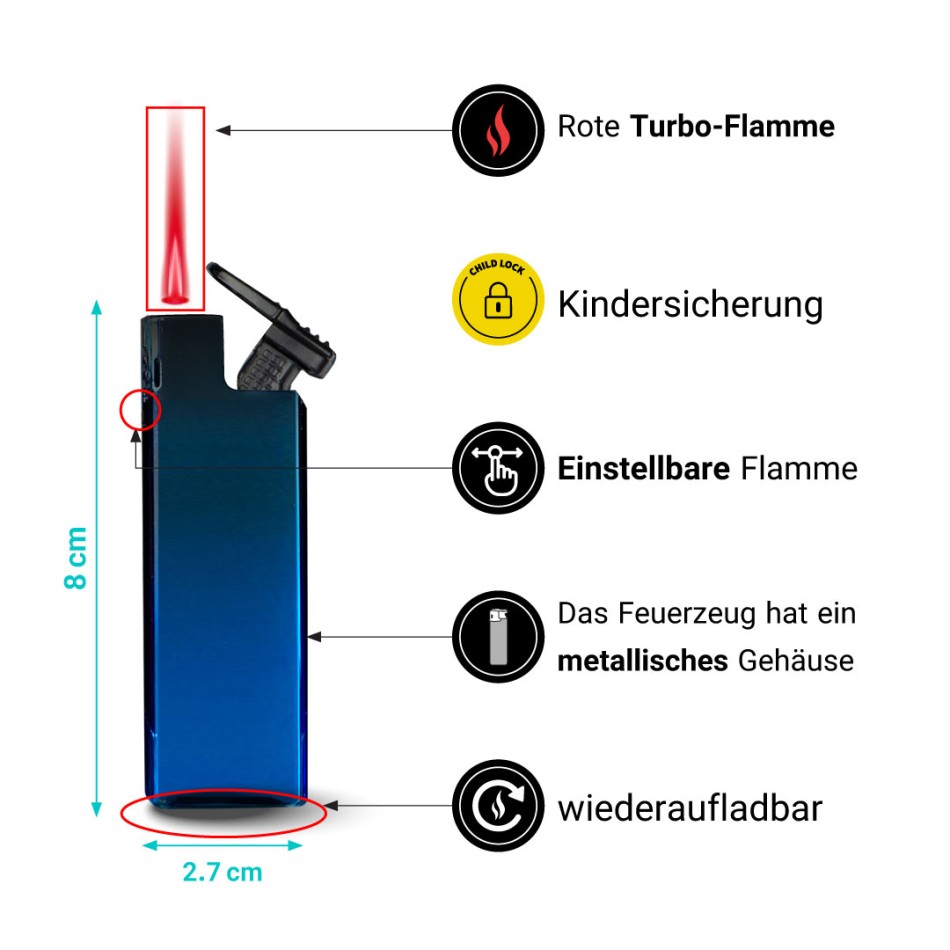 Das Gradient-Feuerzeug ist eine außergewöhnliche Kombination aus modernem Design und hoher Funktionalität. Mit fünf schönen metallischen Farben und einer roten Turbo-Flamme dient dieses Feuerzeug nicht nur zum Anzünden von Feuer, sondern fungiert auch als ein attraktives und unverwechselbares Accessoire.