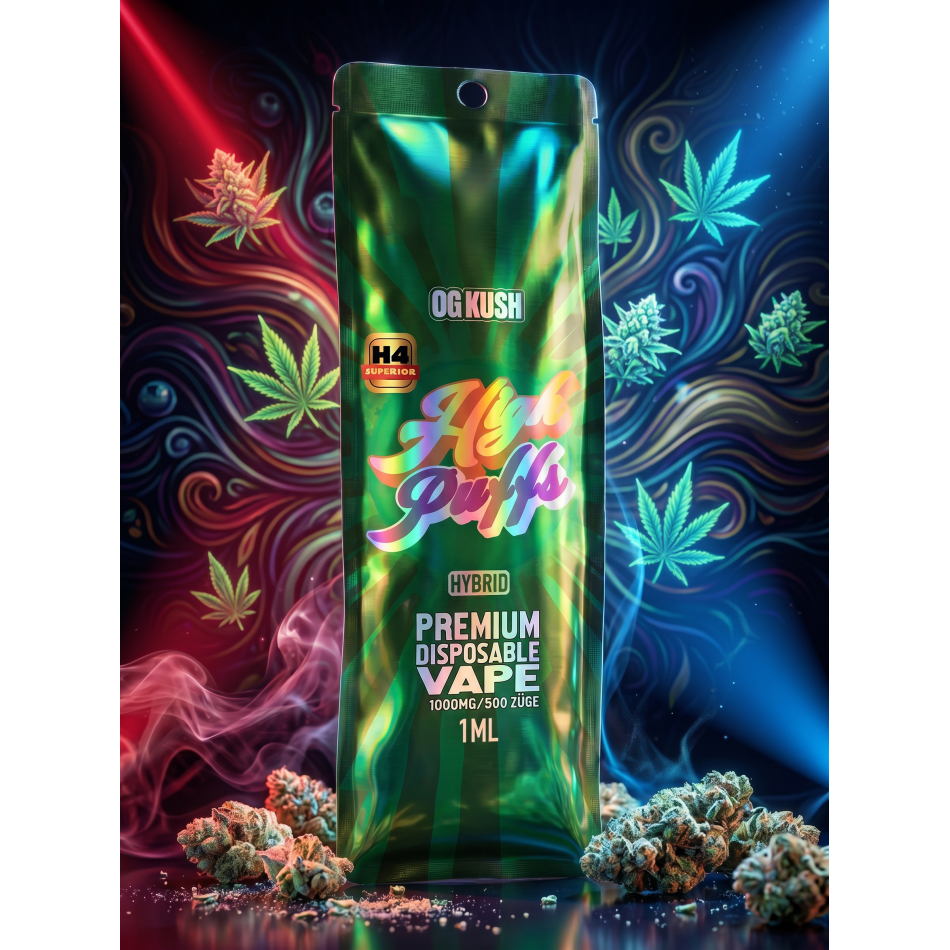 Erlebe intensiven Geschmack und entspannende Indica-Wirkung mit dem High Puffs – OG Kush Vape Pen. Diese hochwertige Einweg-E-Zigarette bietet bis zu 500 Züge voller aromatischer Terpene und Cannabinoide in einer perfekt ausgewogenen Mischung.